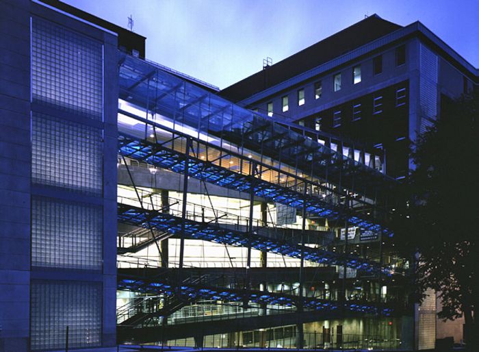 The design of the student center for Columbia University proved to be challenging because of the requirement that it fit within the university’s historical master plan, a 19th-century neoclassical composition by the firm McKim Mead and White. The strategy adopted works within the regulating lines of the original plan, which mandated double wings, and places the major innovation in the “